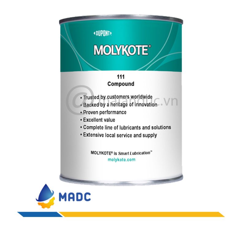 Mỡ Molykote 111 là mỡ bôi trơn van, vòi, vòng gioăng O-ring và các van điều chỉnh đa năng, có độ mềm theo NLGI (National Lubricating Grease Institute) ở mức 3-4, mỡ có các thành phần chính là: Dầu gốc làm từ dầu Silicon, chất làm đặc Silica ( gel Axit Silixic) và chất bôi trơn rắn Silica.